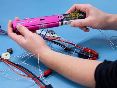 Dyson engineers have live video feeds from other labs around the world, including Singapore and Shanghai, so that they can see what they’re working on, and take over development when one shift ends, and the other begins. Part of this is taking apart competitors’ products to see how they tick, and compare. “It’s true that you get what you pay for,” says Boyce. “How much do people value safety? There’s some concerning stuff out on the market. If you take other products apart, some are literally held together with tape.”