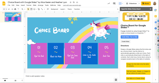 Paula at Slidesmania provides FREE Google Slides (and PowerPoint and Canva) templates for you to have spiffy looking presentations. My add-on Hyperlink Slides Choice Board makes it easy to turn your Google Slides into a choice board with links to the directions for each choice. However, I needed to update the Add-on for it to work with Slidesmania.