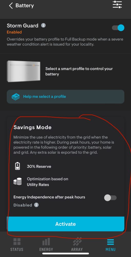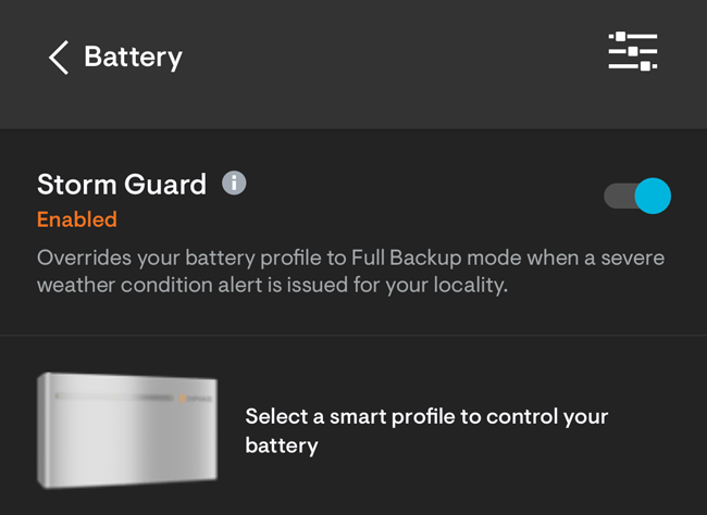 The second advantage is that the batteries act as a power backup during grid outages. They are even smart enough (since they’re connected to the internet) to respond to weather alerts by automatically charging the batteries to 100% in anticipation of an upcoming storm. Believe it or not, if you don’t have battery storage that even on a bright sunny day if the grid goes down, so does your home. This is because power companies don’t want their line personnel in danger of electrocution from the energy that your solar system may send back to the grid while they’re working on the outage. With battery storage, the power to your home is coming from the battery during an outage and nothing is going to the grid. Also unlike a generator, the switch over from grid to battery during an outage takes a millisecond. You would never know the grid was down. You set a minimum reserve percentage of storage so that you always have that amount for unexpected outages. The default is 30%.