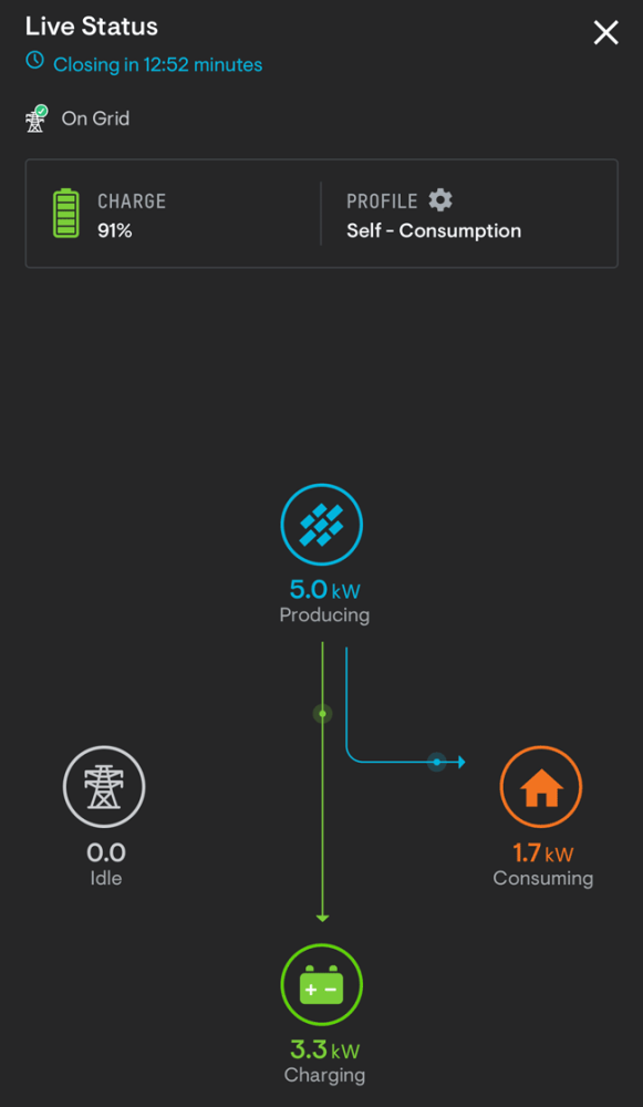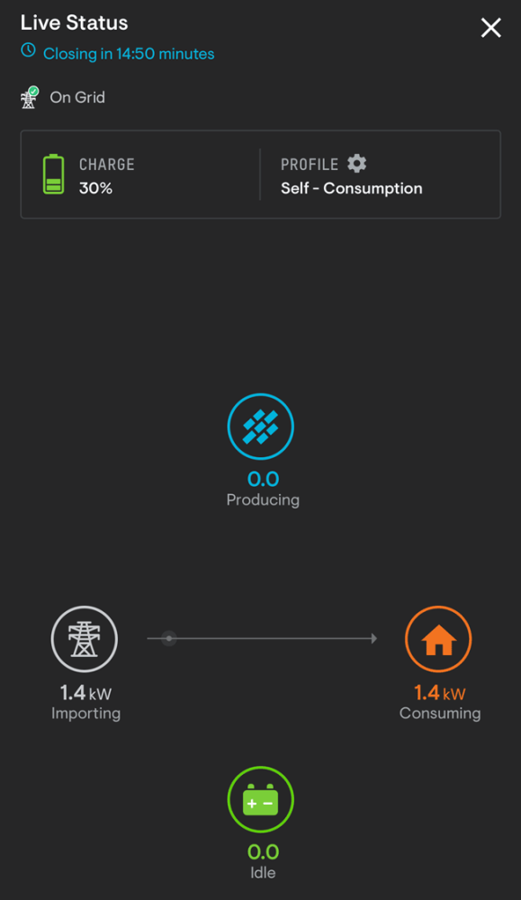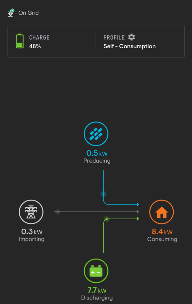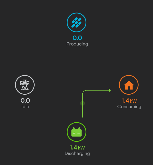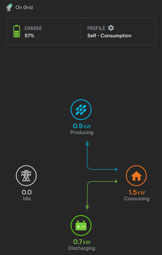 The solar panels either produce enough to run the house or overproduce to also charge the batteries. Yay! – little to no grid use