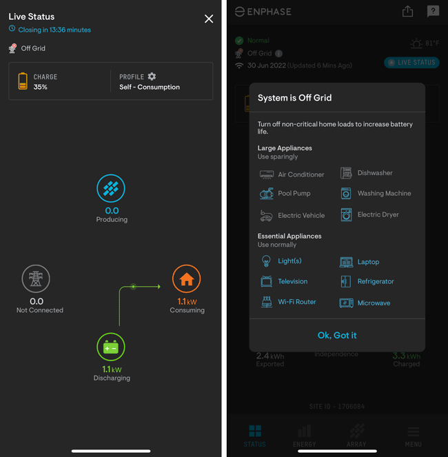 Actually, I was pleasantly surprised that Enphase added generator support to their system for those that have prolonged outages. You can use a generator to seamlessly recharge the batteries during a prolonged outage. The generator would kick on when the batteries are at a level you specify and turn off once the battery is charged back up. You would never know the power was out the entire time.